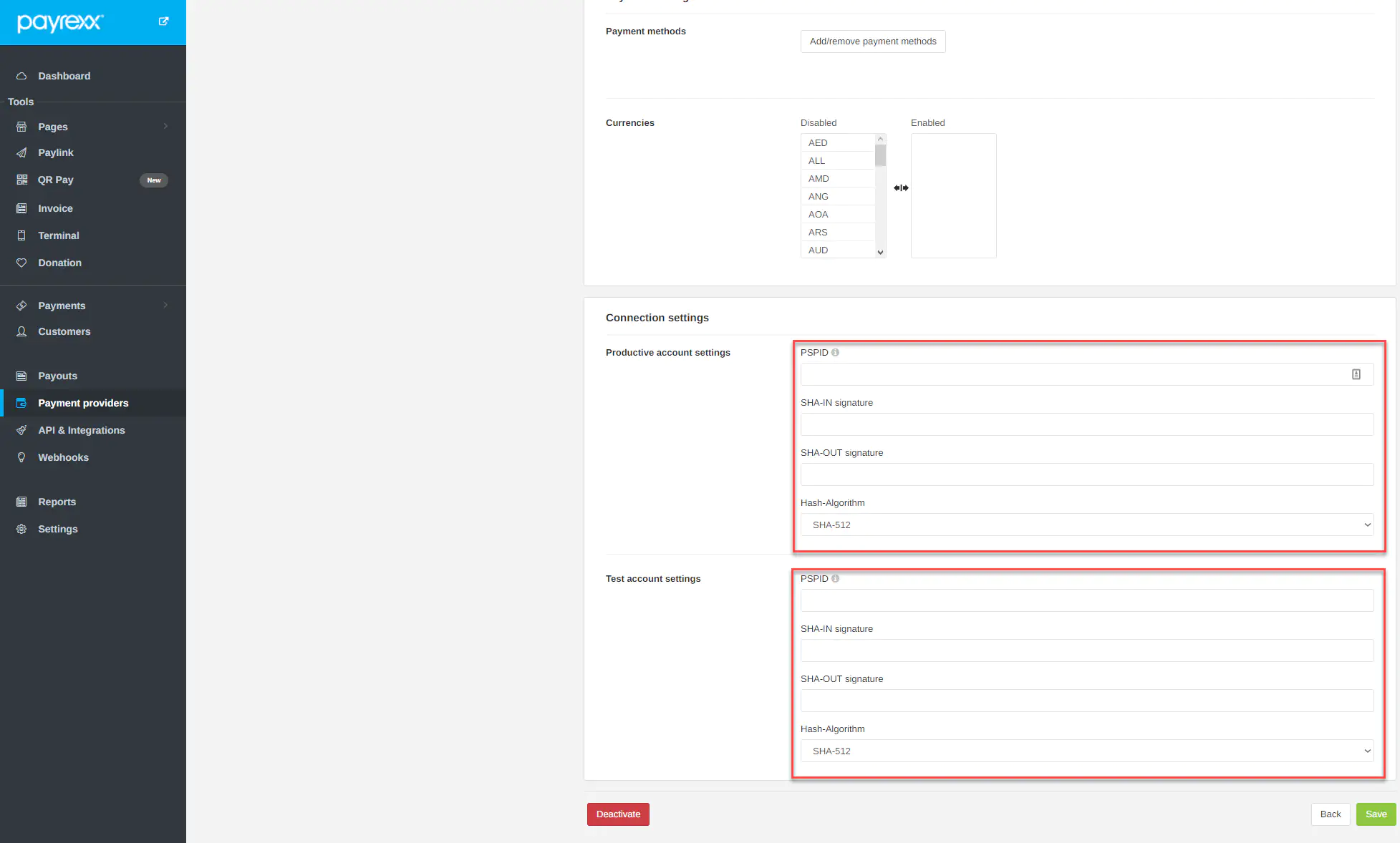 - Make sure the used Hash algorithm matches the one you choose in the payment provider settings of your Payrexx Account 2