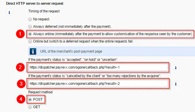 Select the options “Always online” 1 for “Timing of the request” and “POST” 4 for the “Request method” in the section “Direct HTTP server-to-server request”. Then tap on the “Payment Status” 2 and 3 the values https://dispatcher.payrexx.com/ogone/callback.php?result=-1 and https://dispatcher.payrexx.com/ogone/callback.php?result=-2.