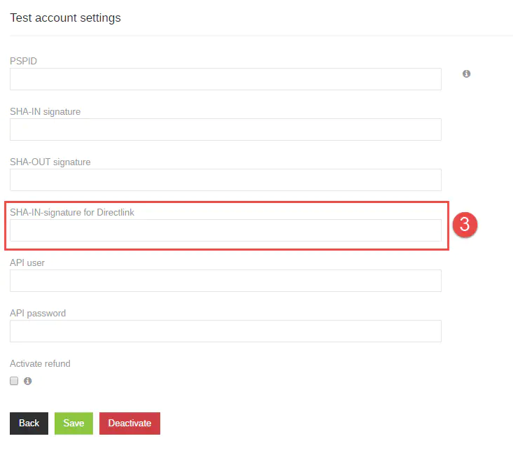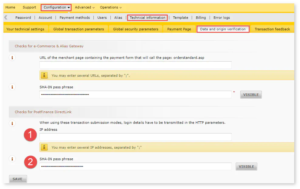 Navigate in the backoffice of PostFinance to “Configuration > Technical information > Data and origin verification”. Leave the IP address field [1] empty. At the field, SHA-IN pass phrase [2] in the section “Checks for PostFinance DirectLink”, insert the SHA-IN signature for Directlink [3]. You can find it in your Payrexx backend at “Settings > Payment providers > PostFinance Alias Gateway”.