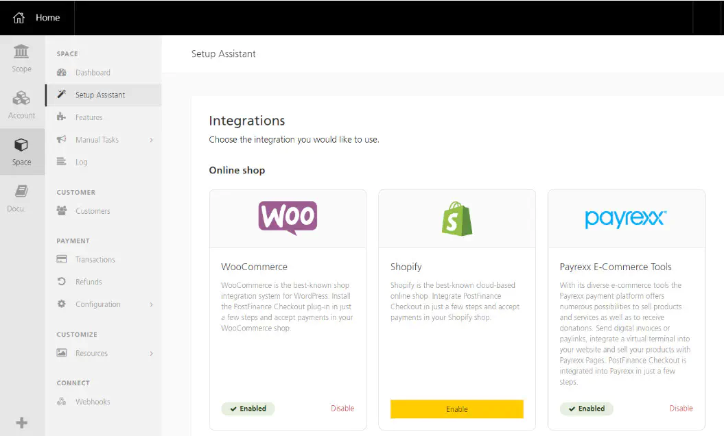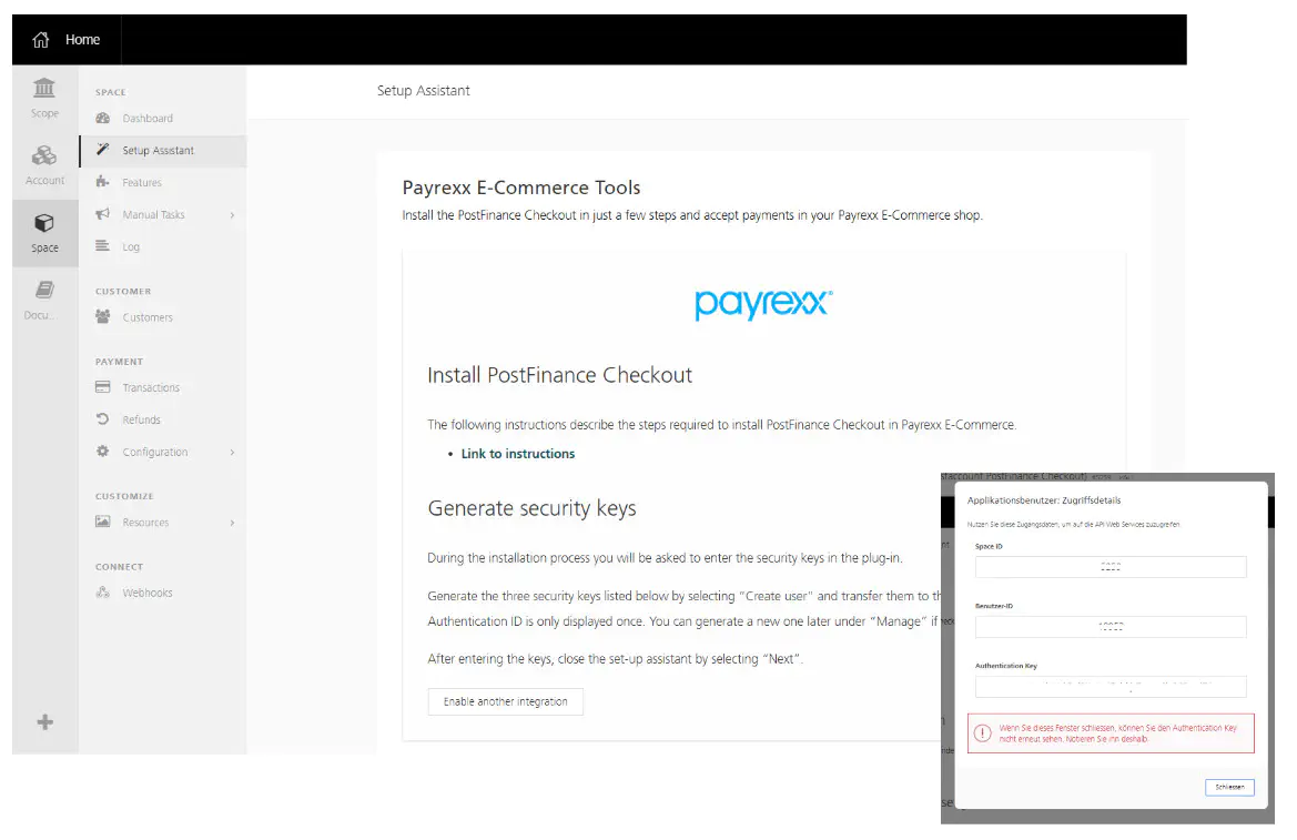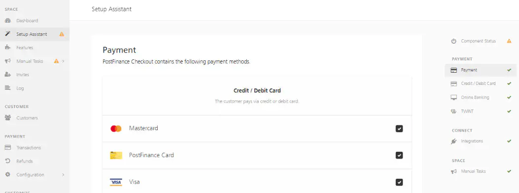 Follow the instructions in the set-up assistant. Once you have done this, PostFinance Checkout is ready for a free test using payment screen simulators.