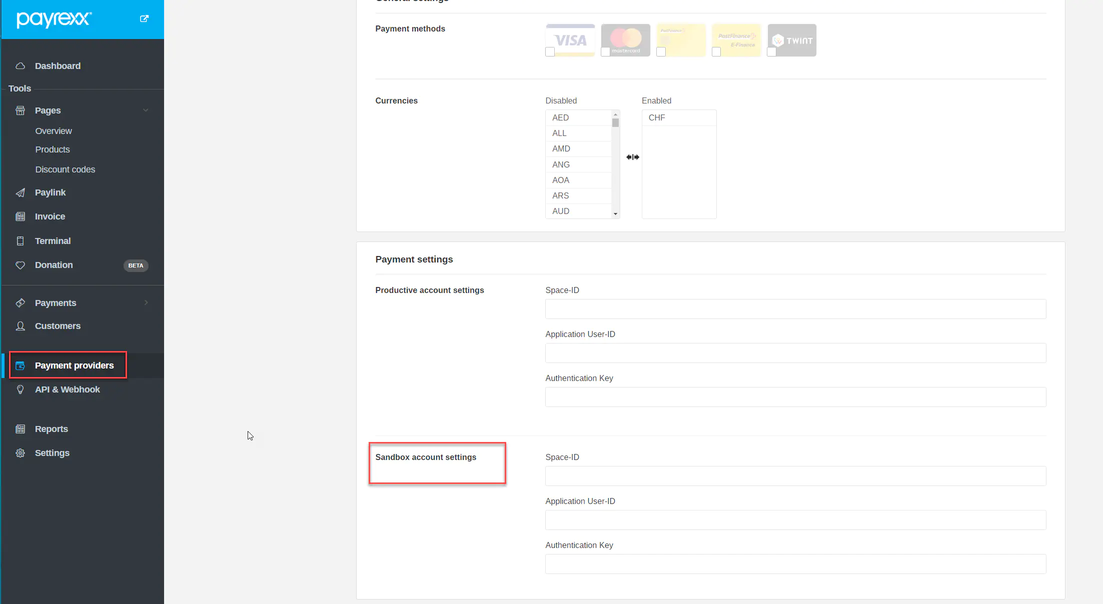 - Add the three details in Payrexx under Payment provider > PostFinance Checkout. Make sure that you paste it under “Sandbox”.