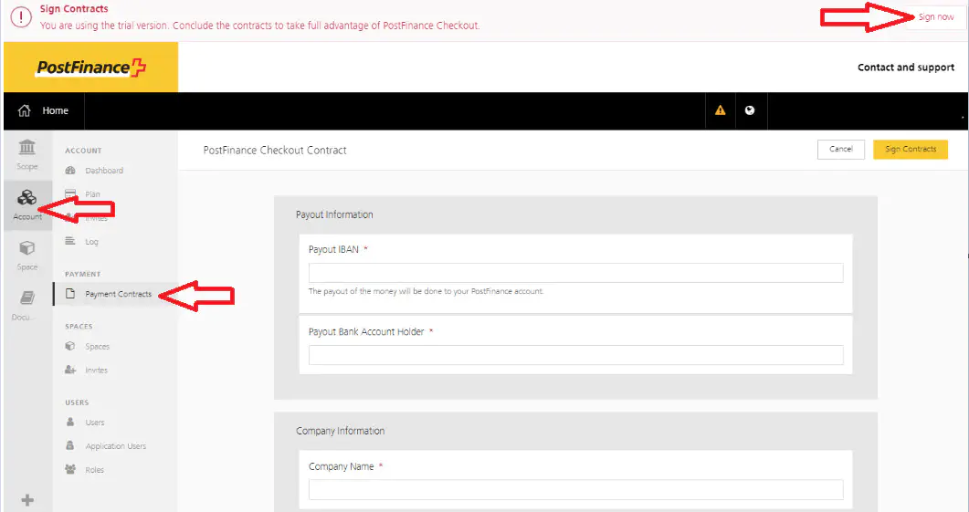 The contract can be concluded online in the “Account” menu, either by clicking on Sign now in the header notification Sign Contracts or directly under Payment contracts.
