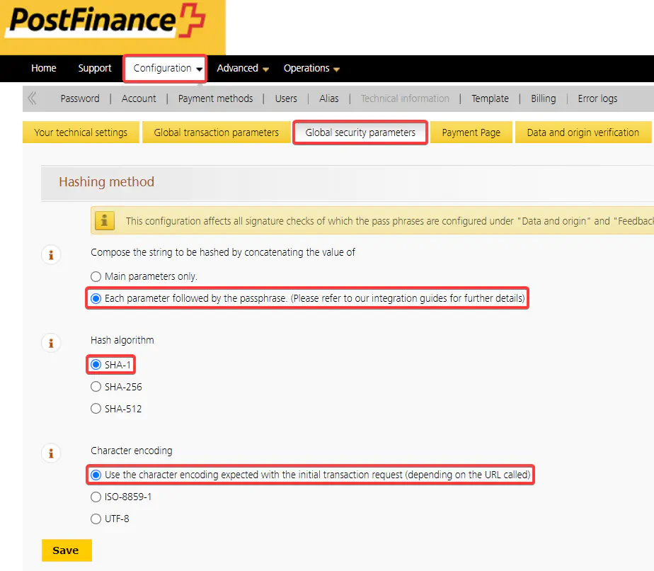 Navigate to “Global security parameters” and select the options “Each parameter”, “SHA-1” and “Use the character encoding expected with the initial transaction request”. Then click “Save”.
