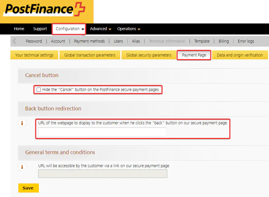 Navigate to “Payment page” and check if the following values are empty. Please note that these values need to be deactivated / left empty. Click “Save”.