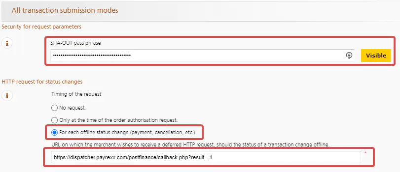 Next, under “All transaction transfer modes” in the “SHA-OUT signature” field, insert the value that you have stored in the PayLink backend under “Home > Settings > Payment provider > PostFinance” in the “SHA-OUT signature” field. The value for the “SHA-OUT signature” can be freely selected, but must correspond to a SHA-1 signature. Then select the option “For each offline status change” under “HTTP request for status changes”. Also note that under “URL to which the merchant wants a deferred HTTP request in case of an offline change of a transaction status.” you have entered the following value