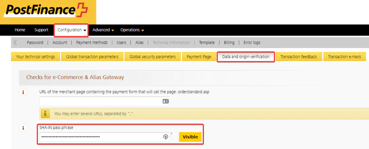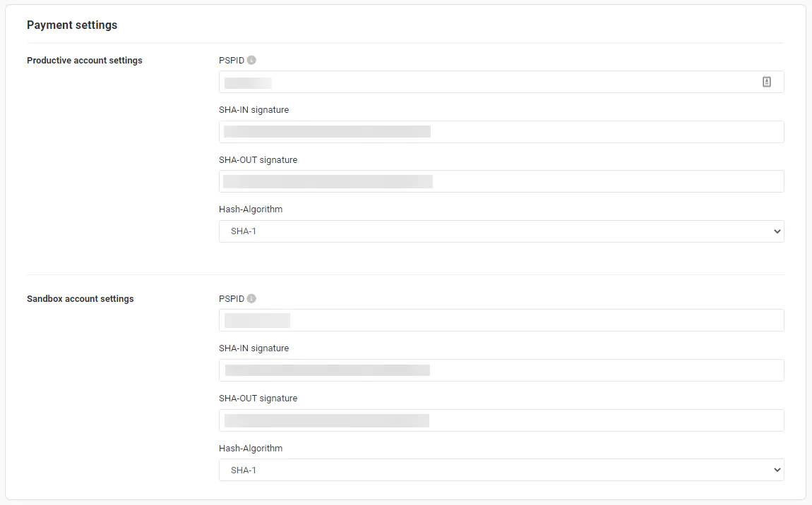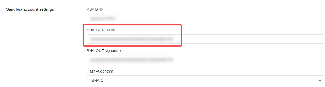 Enter the value for “SHA-IN pass phrase” which you defined in the Payrexx administration under “Payment providers > PostFinance PSP > Configure > Sandbox account settings” in the field “SHA-IN signature”.