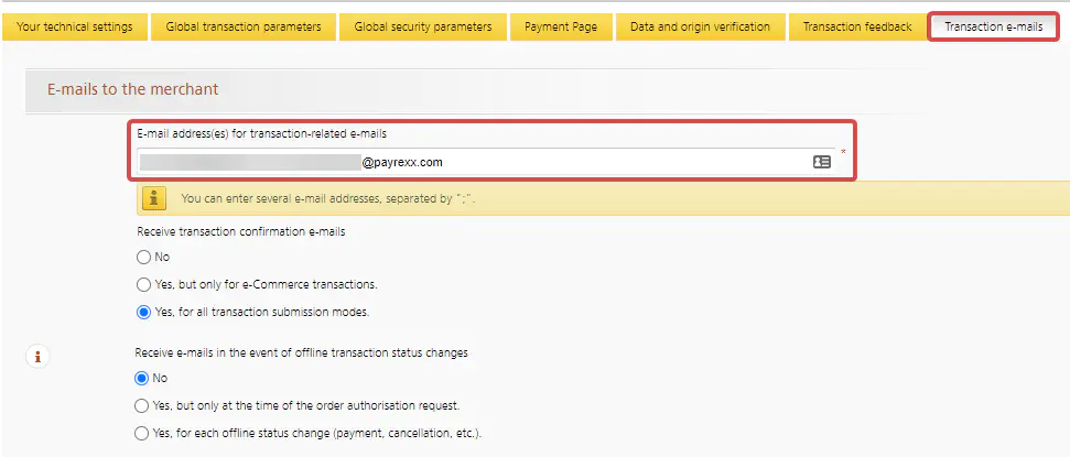 Navigate to “Transaction e-mails” and enter your e-mail address in the field “E-mails address(es) for transaction-related e-mails”. Then click on the button “Save”.