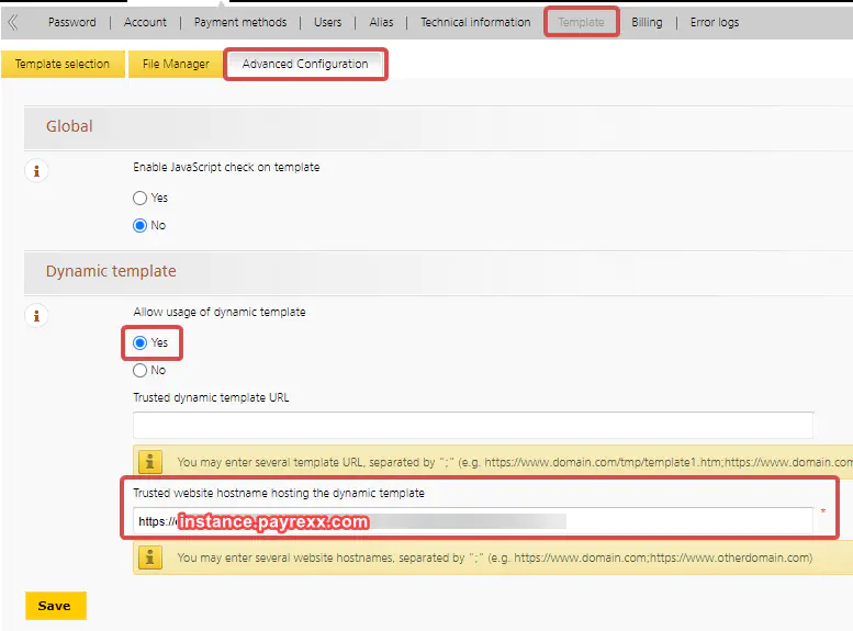 At the end, go to “Configure > Template”. Select “Yes” for “Allow use of dynamic template” and type in the value shown in the image for the field “Host name of trusted website as host of dynamic template”. Please note that “instance” must be replaced by your instance name (name of your account) under which you registered. Then click on the “Save” button.