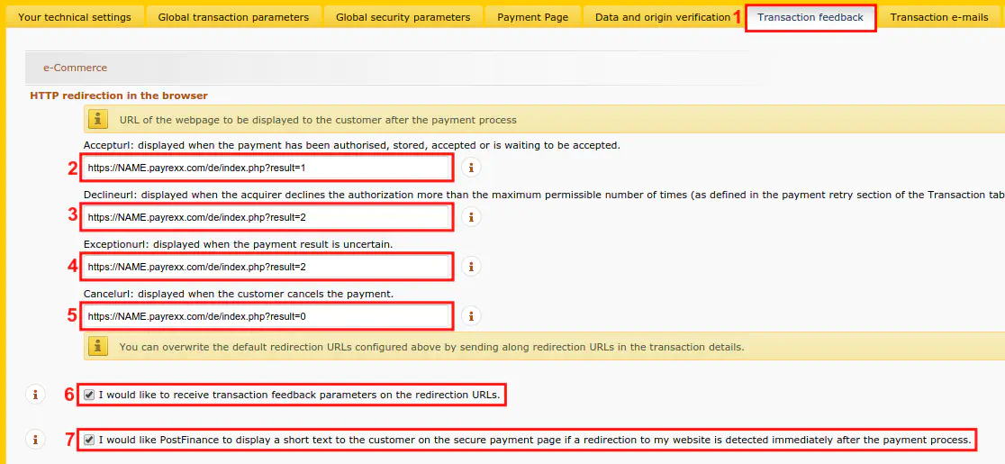 Navigate to “Transaction feedback” [1]. Enter the values for the fields “AcceptURL” [2], “DeclineURL” [3], “ExceptionURL” [4] and “CancelURL” [5] in the section “HTTP redirection in the browser” which can be seen on the picture. Replace the word “NAME” again with your installation’s subdomain. Ensure that the checkboxes [6] and [7] have been checked. (If you are using Payrexx UK, make sure that the checkbox [7] is not checked.)