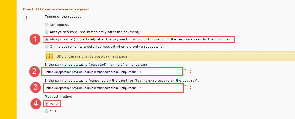 Select the options “Always online” [1] for “Timing of the request” and “POST” [4] for the “Request method”. Then type in the values: