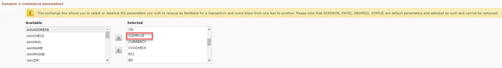 As the next step enable under “Dynamic Ecommerce Parameters” COMPLUS & ORDERID, otherwise the server-to-server feedback will not work.