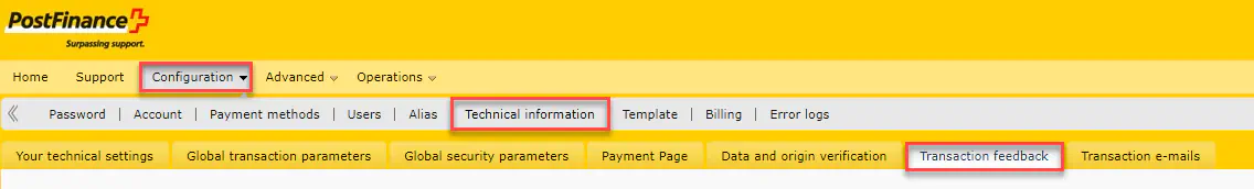 - Go to “Configuration > Technical information > Transaction feedback”: