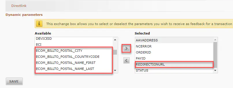 - Under “Directlink” move the parameter “REDIRECTIONURL” and all “ECOM_” parameters to the right side: