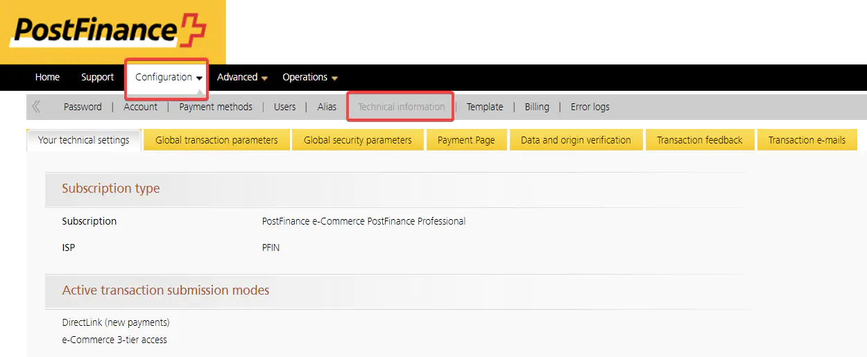 Visit the URL https://e-payment.postfinance.ch/ncol/test/backoffice with your web browser (as long as your instance is still running in test mode), otherwise use the URL https://e-payment.postfinance.ch/ncol/prod/backoffice. Enter your PSPID and your password, then click on “Submit”. After the login has been successfully completed, navigate to “Configuration > Technical information”.