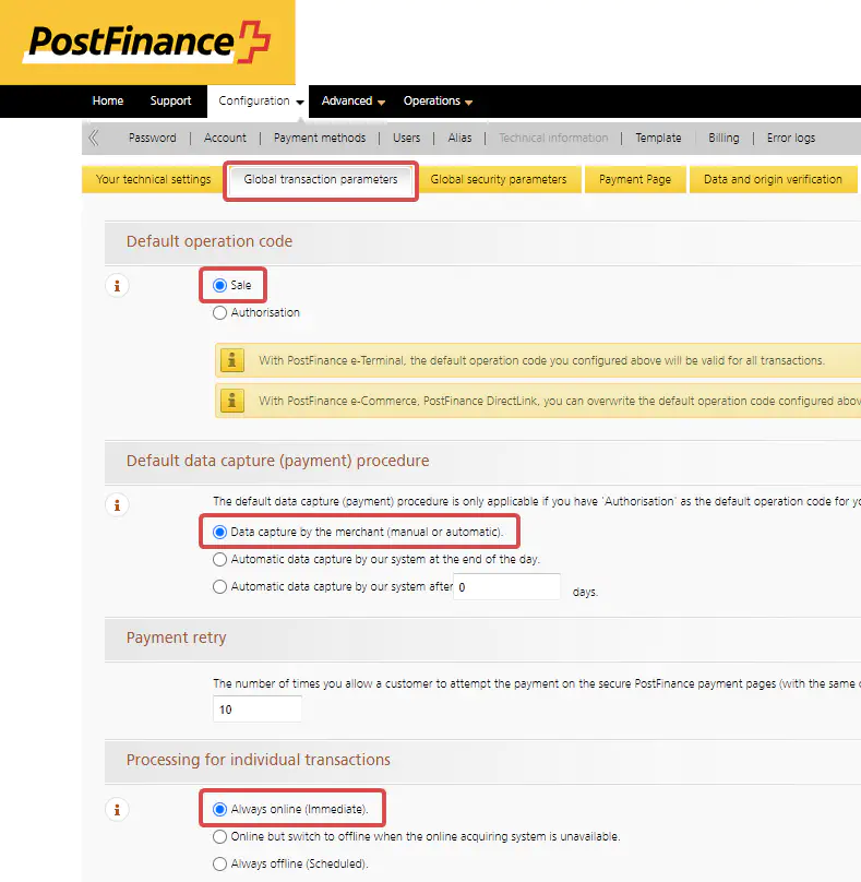Navigate to “Global transaction parameters” and ensure that the “Default operation code” is set on “Sale”, the “Default data capture (payment) procedure” is set to “Data capture by the merchant (manual or automatic)” and in the section “Processing for individual transactions” the option “Always online (Immediate)” is selected. Then click on the button “Save”.