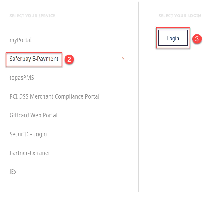 Go to the website of Saferpay, click on “Login” on the top right and then on “Saferpay E-Payment” on the windows that pops up. Afterwards, click on “Login”: