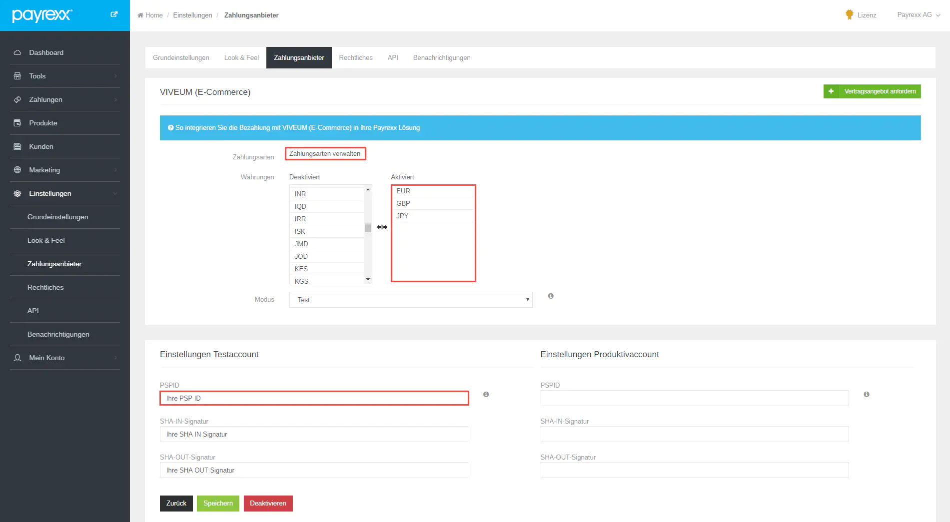 - You are going to be sent an e-mail with your login credentials. Insert this data in the input fields shown below. You can find these by following the patch “Settings > Payment providers > Viveum (E-Commerce). Activate the preferred methods of payment as well as the currencies you would like to accept.