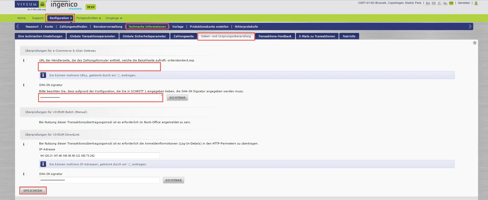 In the tab menu navigate to “Data- and origin check” [1]. The field “Merchant’s URL” should always be empty. The safety is being ensured by the SHA-IN signature. At “SHA-IN signature” enter the value you deposited in the field “SH-IN signature” in your Payrexx backend under “Home > Settings > Payment provider > Viveum”. The value for the “SHA-IN signature” can be chosen at will. Following click on “Save”.