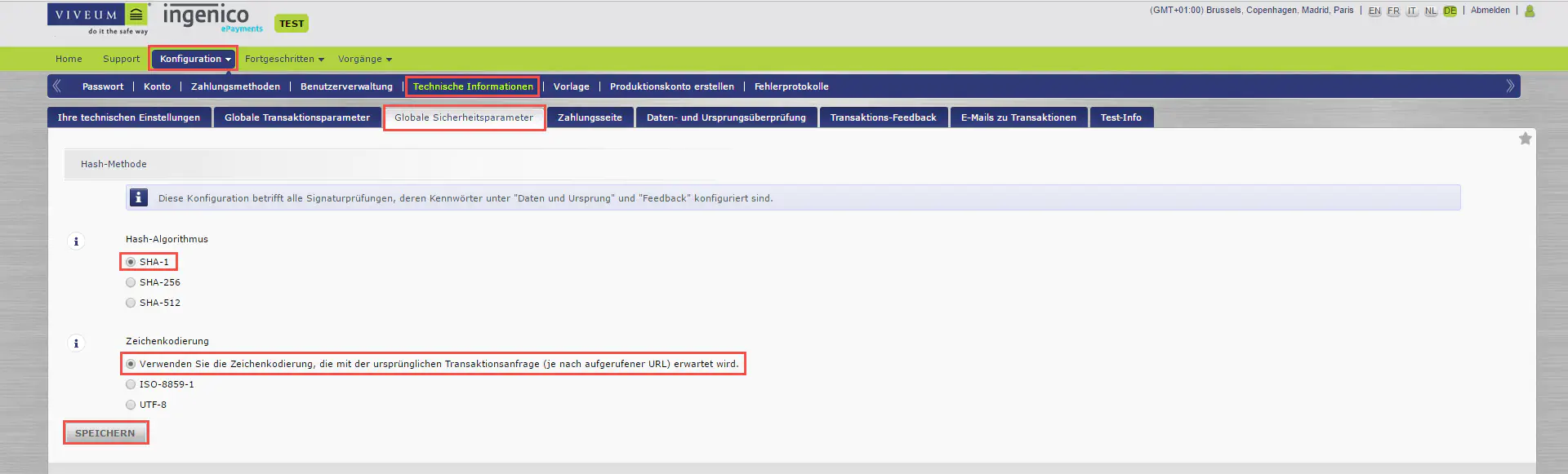 Navigate to “Global safety parameters” and check if under “Hash-method” the option “Every parameter”, “SHA-1” and “Use the character encoding expected with the original transaction request” are selected. If this is not the case, make sure to change it.