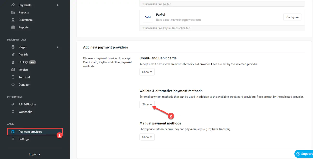 In your Payrexx backend, click “Payment providers”, scroll down and click on “Show” under “Alternative payment methods”. Then search for “boncard” in the list and click on “set up”.