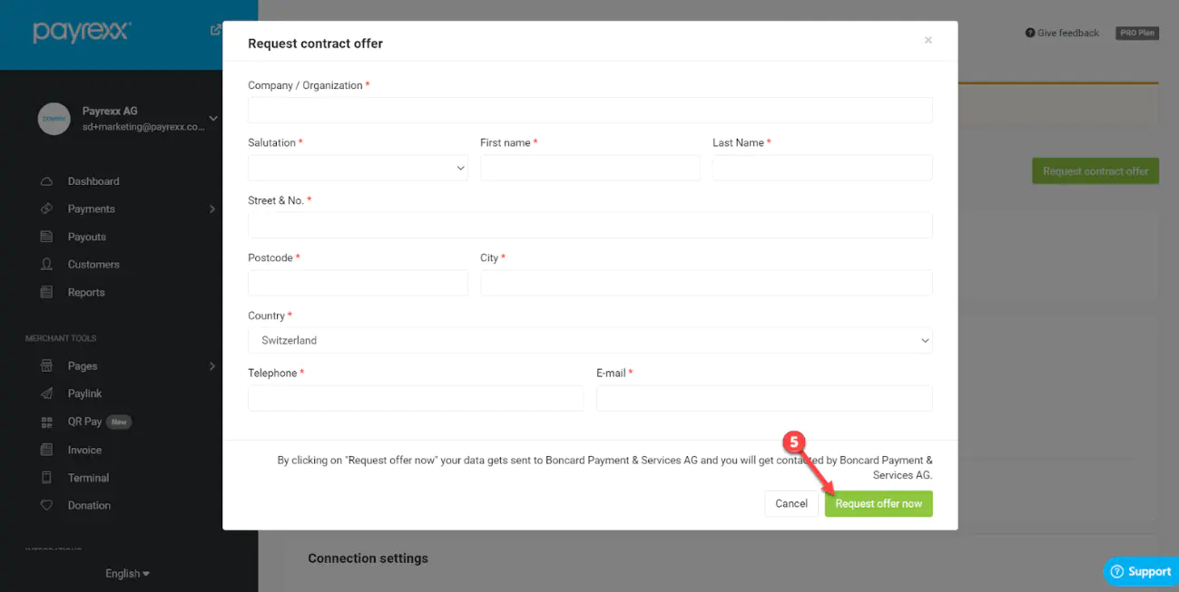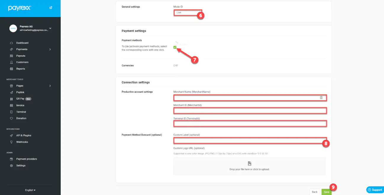 As soon as everything is completed with Boncard, you will receive a merchant name, a merchant ID and a terminal ID, which you then have to enter in your Payrexx merchant administration. You also have to switch the mode to live and activate the Boncard with the checkbox. Finally, save everything and you’re good to go.