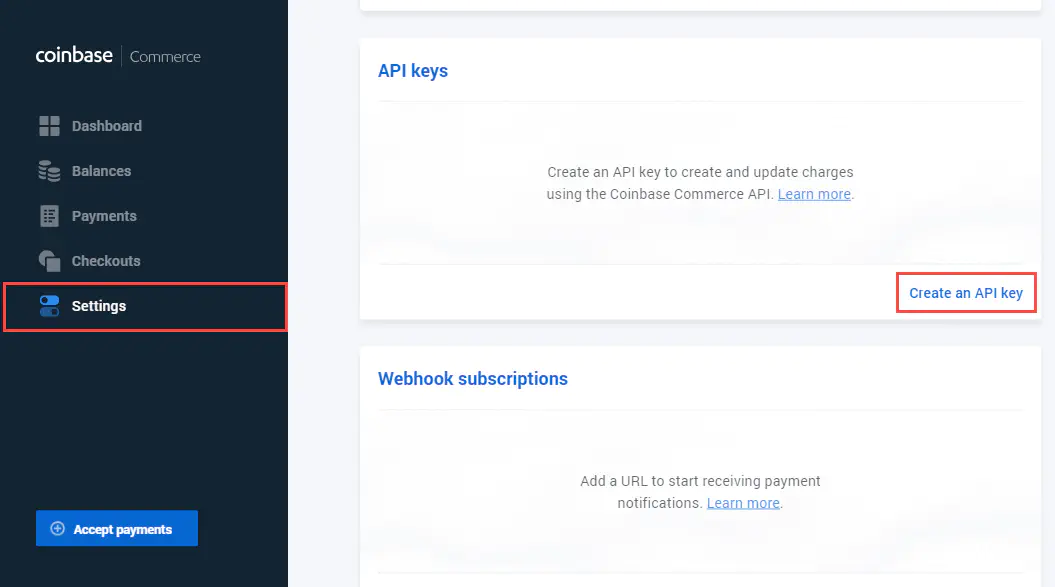 Go to “Settings” and choose “Create an API key”.