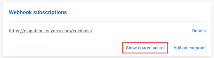 Copy the Webhook secret and paste it into the Coinbase settings in your Payrexx account (“Payment providers > Coinbase > Edit”).
