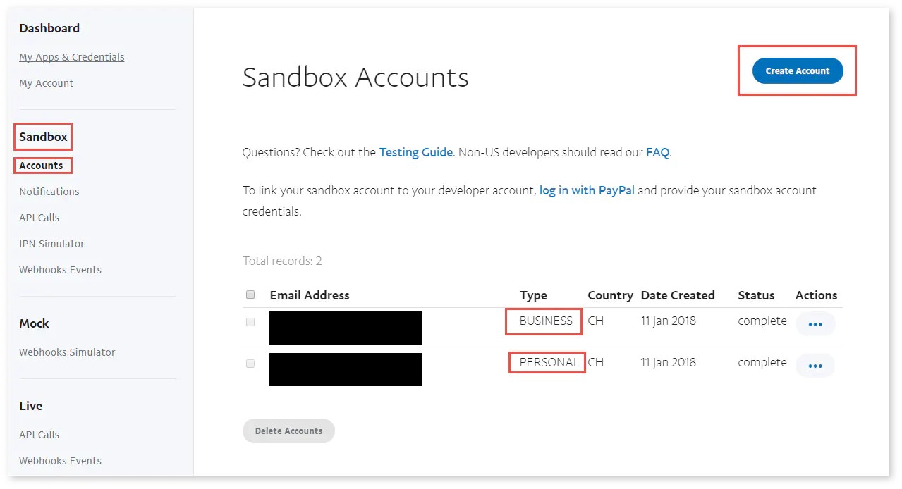 Log in at the PayPal developer website. Create a business account (-facilitator@) as well as a personal account (-buyer@) by clicking “Sandbox > Accounts > Create Account”: