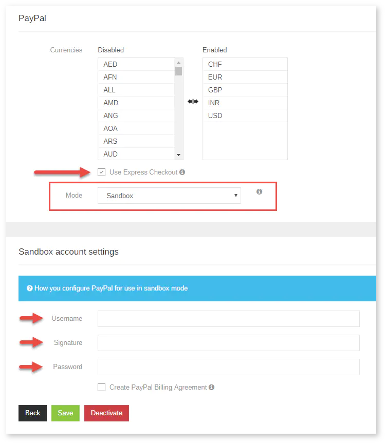Once you are in the settings of PayPal, set a checkmark at “Use Express Checkout”. Insert the API Credentials (username, password and signature) there. Do not forget to choose the mode “Sandbox”: