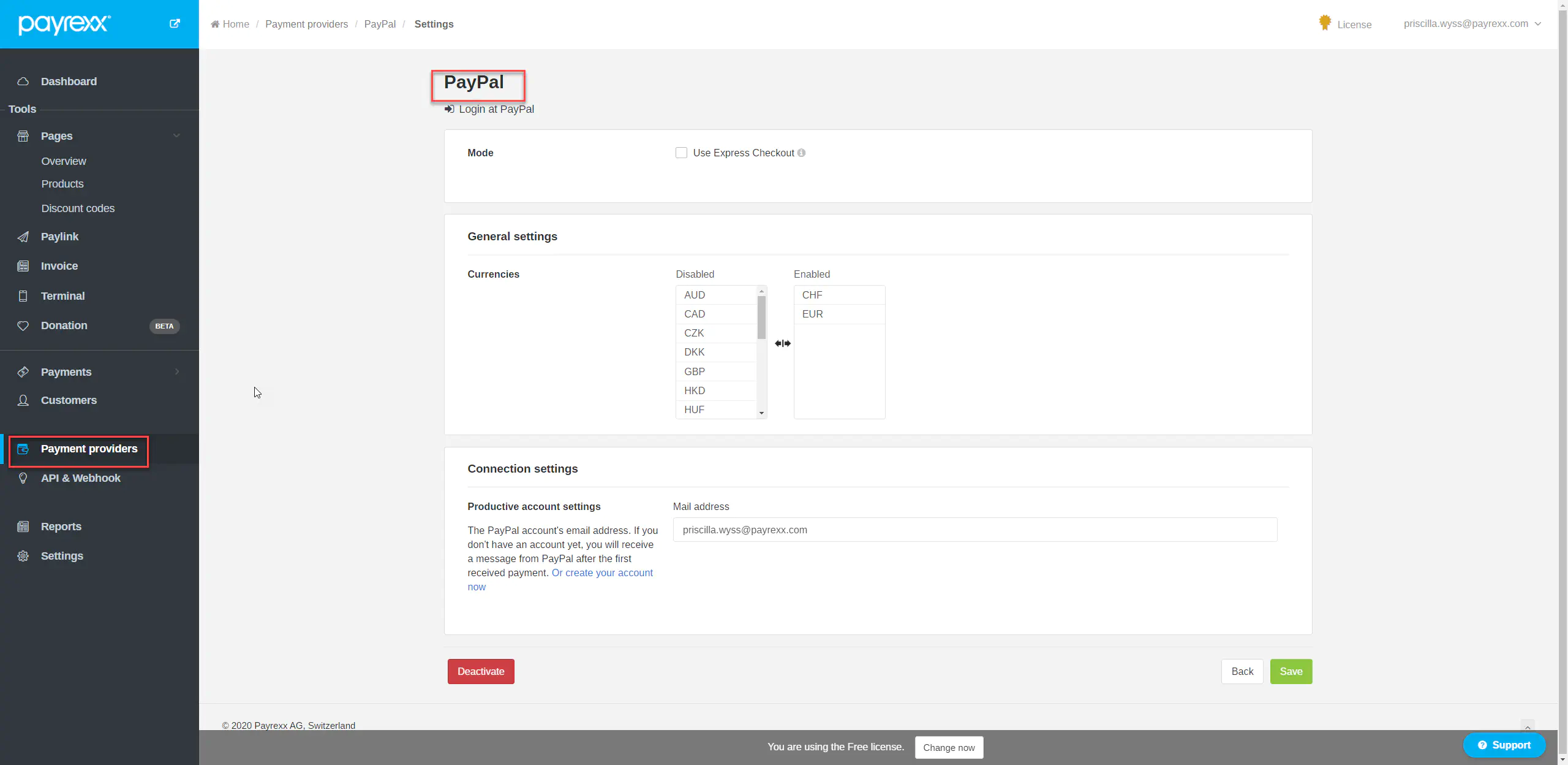 - In your Payrexx account, navigate to payment provider -> PayPal