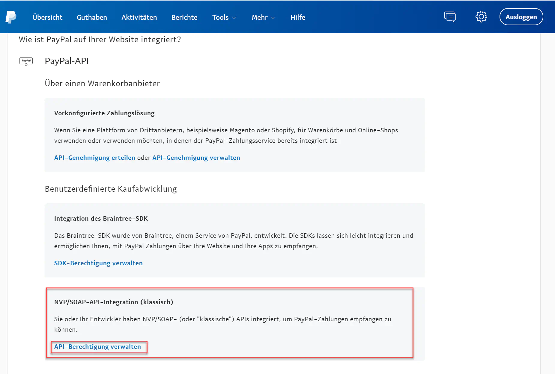 Now select “Manage API Authorization” under “NVP/SOAP API Integration (Classic)”.