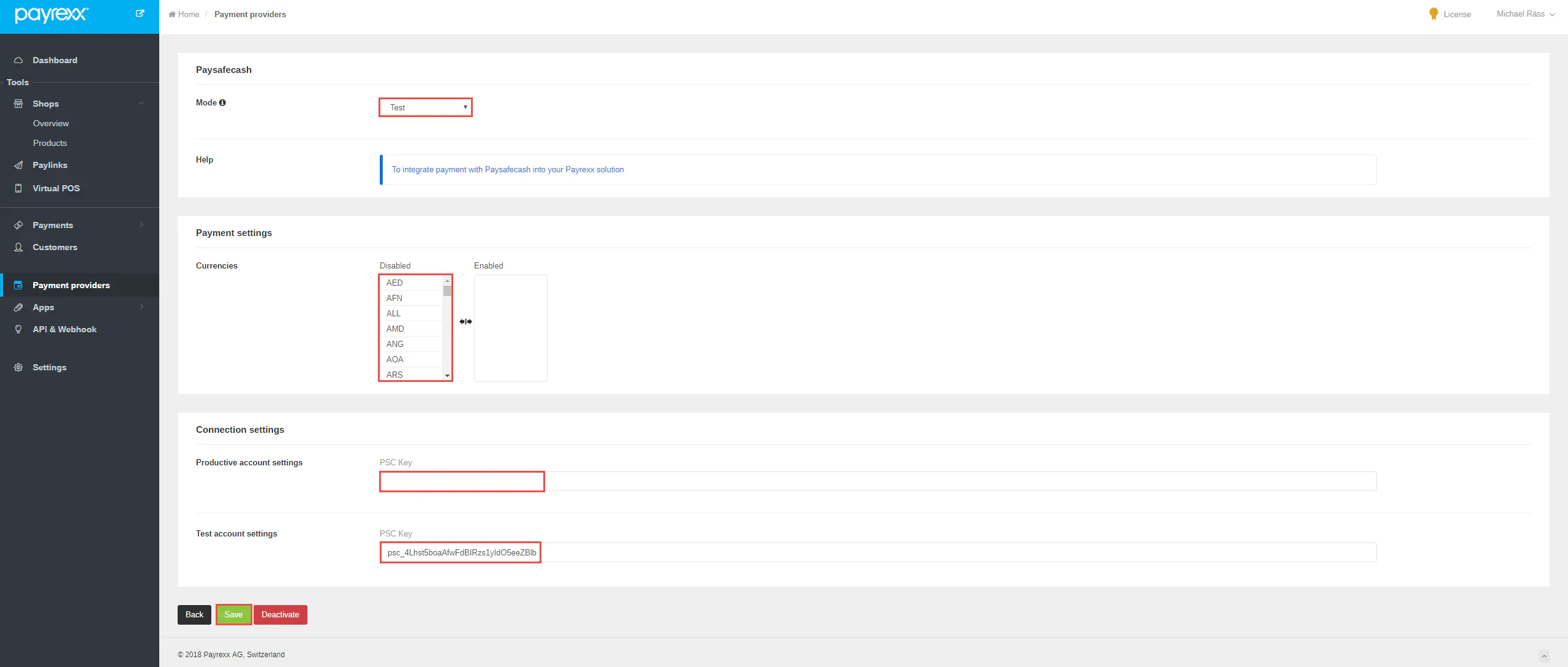 3. Copy and paste either the test (for test payments) or the live (for live payments) PSC key. Change between test and live mode, activate the required currencies.