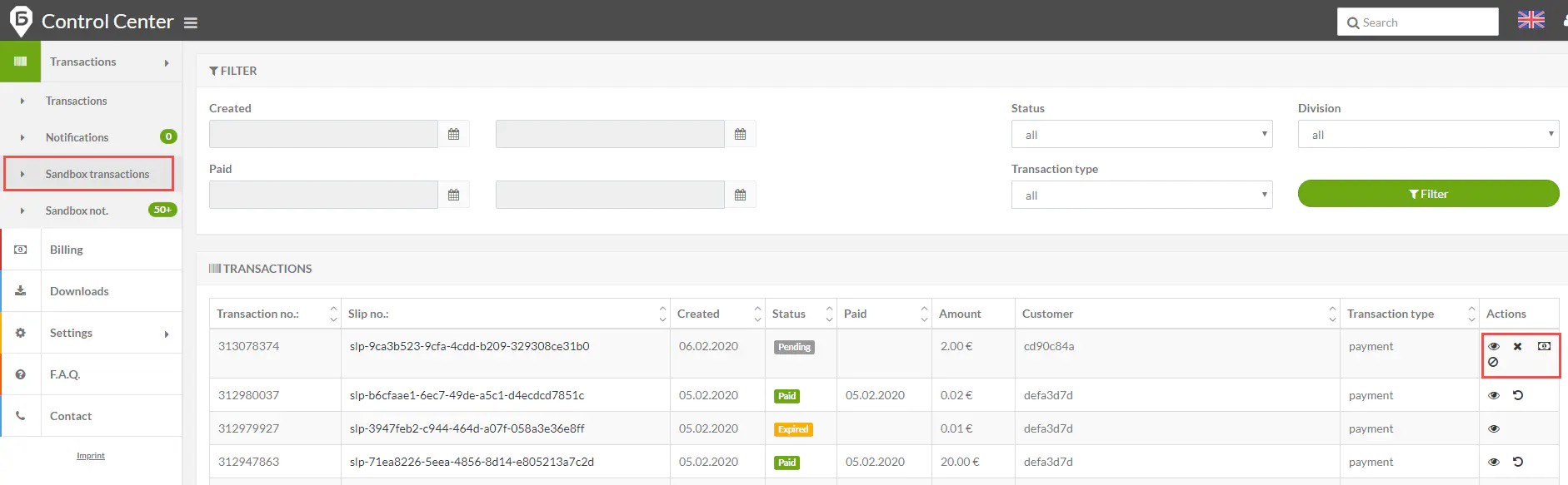 Configure the sandbox mode in the Payrexx account to test the process. To do this, select the “Sandbox” mode for the payment provider viacash. In your viacash account, you can simulate actions such as process and payment by clicking on the various actions under “Transactions > Sandbox transactions” (on the right under “Actions”).