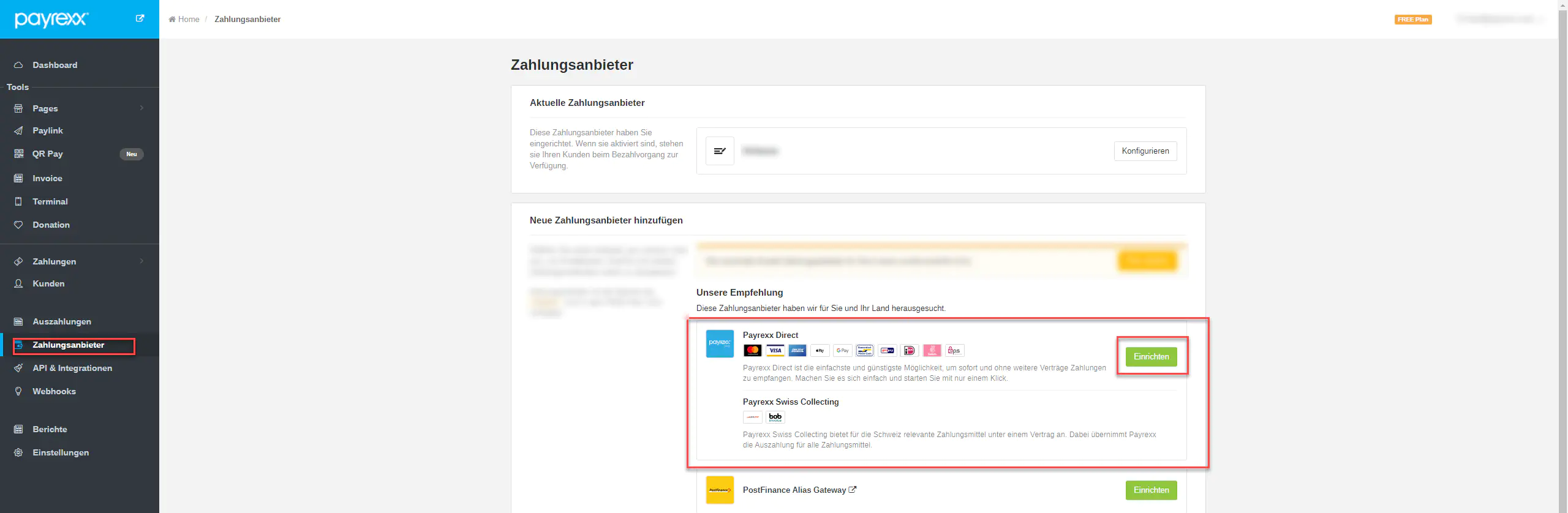 1. Set up Payrexx Direct as the payment provider. If Payrexx Direct is not available in your country, you can also use Stripe as payment provider.