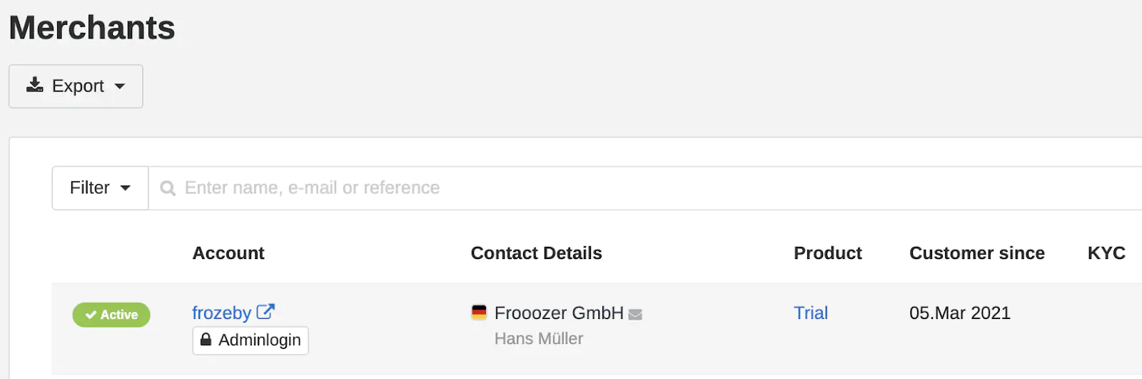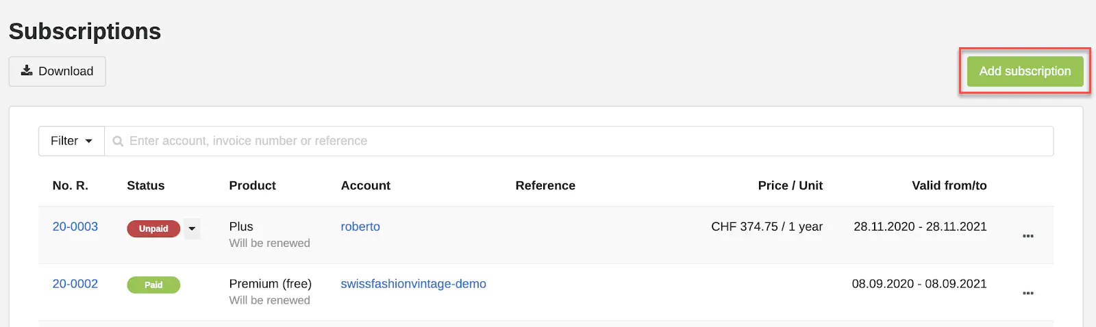Under “Subscriptions”, you can see all billed subscriptions. It is also possible to create subscriptions from here and assign it to a merchant account.
