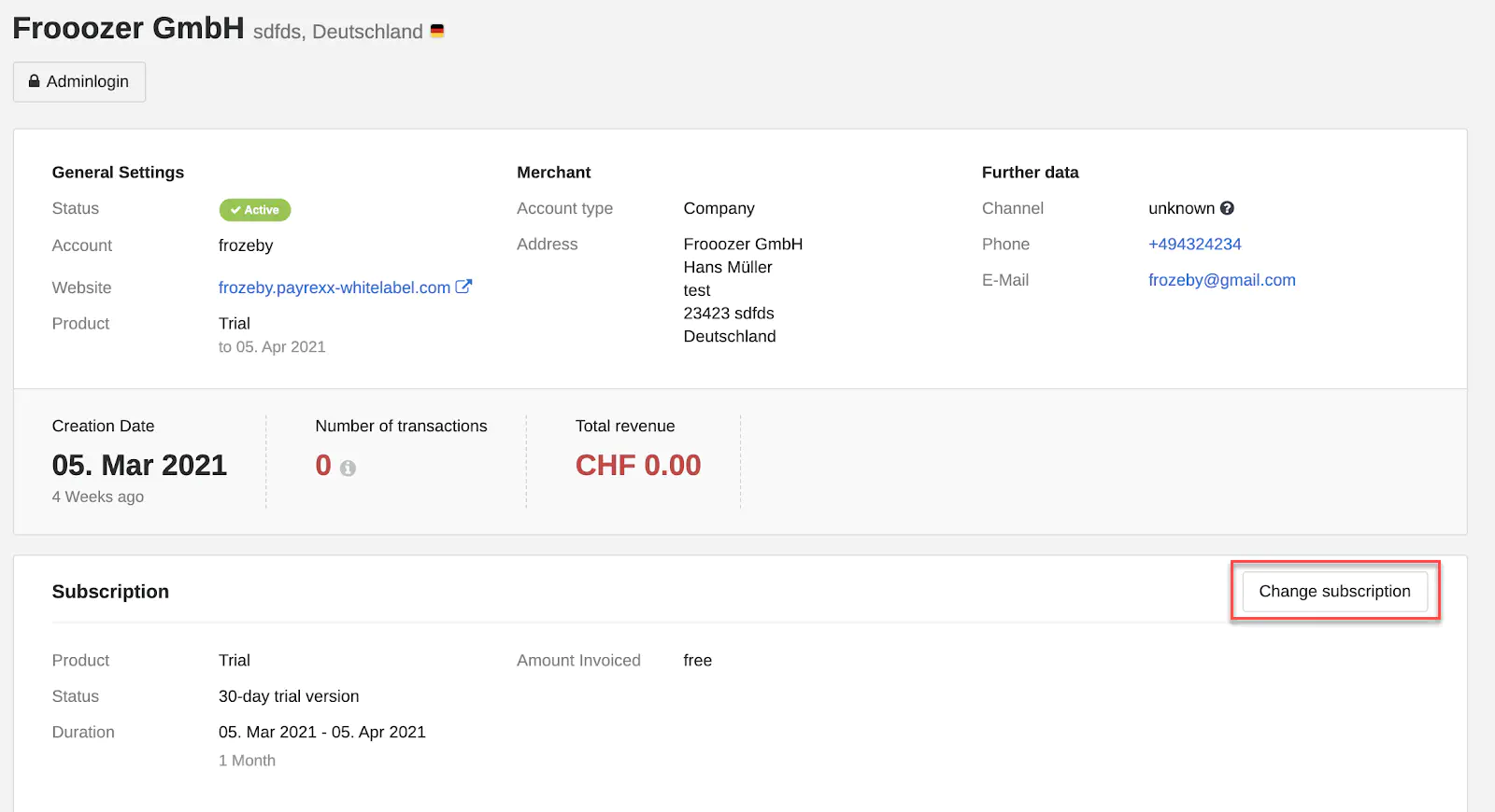 Now you see the company details and the current subscription the merchant is using. By clicking “Change subscription” you can create a new one.