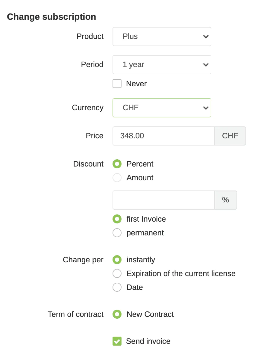 Here you see if the subscription was paid by the merchant. You have the option to put the status to “Paid” yourself too - if the merchant pays the bill through wire transfer, for example.